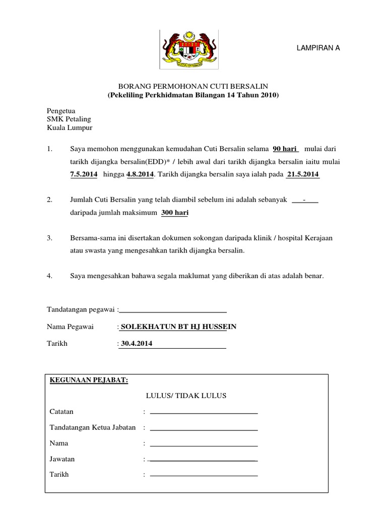 Borang Cuti Bersalin Official A Borang Permohonan Cuti Bersalin Pekeliling Perkhidmatan Bilangan 14 Tahun 2010