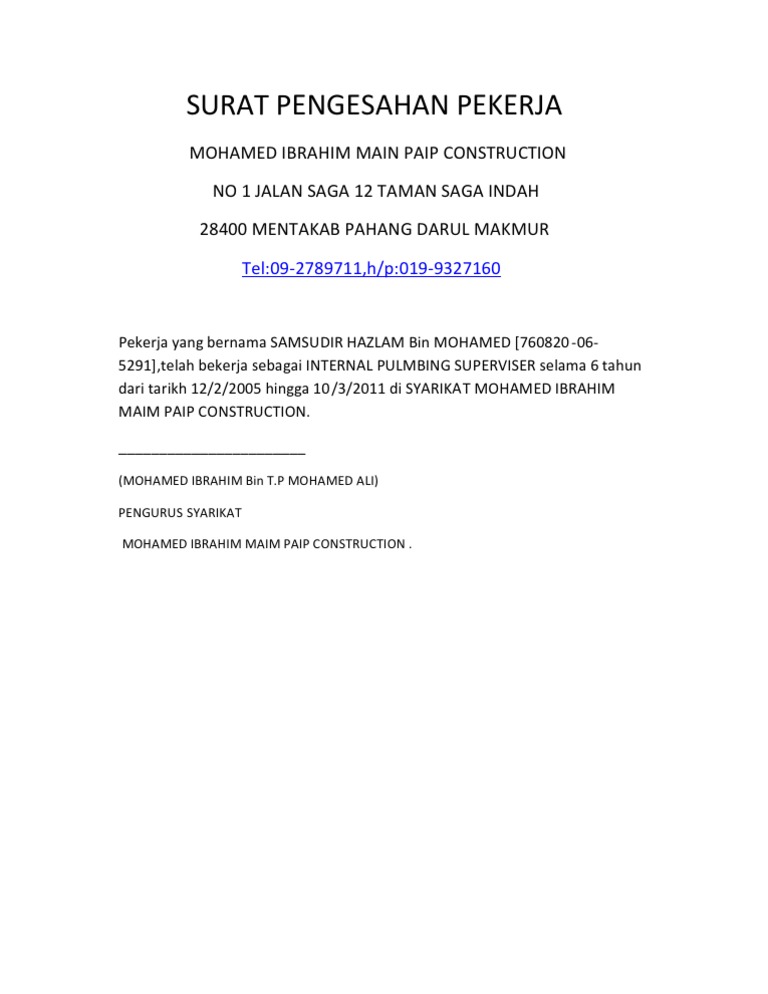 No kp telah bertugas sejak dari tahun 2010 di xyz sdn. Contoh surat pengesahan majikan dan jawatan. Didalam surat ini perlu dipaparkan maklumat pekerja jawatan tempoh perkhidmatan gaji dan sebagainya yang berkenaan. Surat ini dikeluarkan oleh majikan bagi mengesahkan jawatan yang disandang di sesuatu tempat kerja.