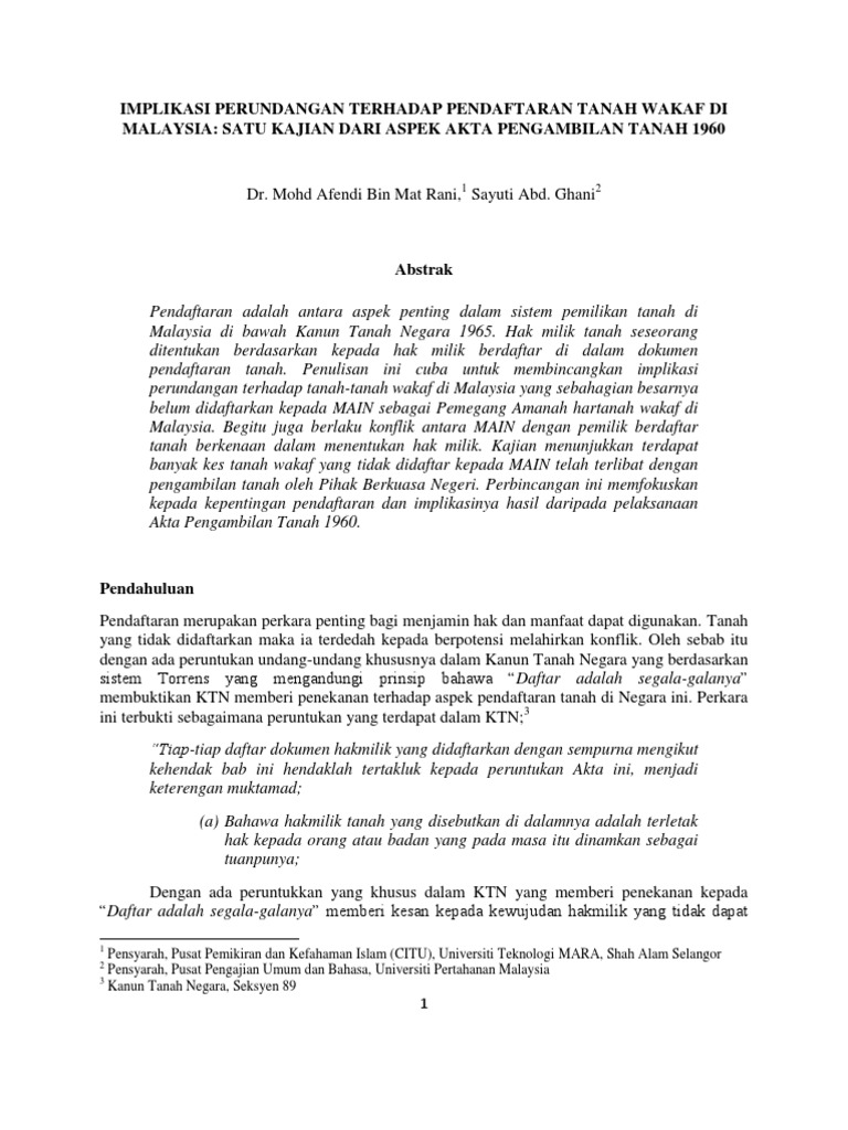 Pdf Kanun Tanah Negara 1965 Kajian Tinjauan Terhadap Keperluan Pendaftaran Tanah Wakaf National Land Code 1965 And Requirements For Wakaf Land Registration