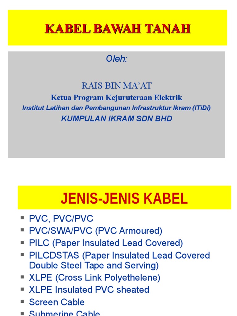 Selain itu kabel yang dipilih juga bukan sembarang kabel melainkan kabel tertentu saja yang benar benar cocok untuk ditanamkan di bawah tanah. Rais bin ma at ketua program kejuruteraan elektrik institut latihan dan pembangunan infrastruktur ikram itidi kumpulan ikram sdn bhd 2. Helaian penerangan ini bertujuan menerangkan rekabentuk pepasangan sesalur kabel bawah tanah yang terdapat pada sesuatu pepasangan industri serta dapat memantapkan lagi pengetahuan dan kemahiran dalam melakukan kerja kerja penyelengaraan pepasangan elektrik voltan rendah.