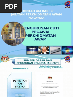 Perintah am p a 13 51 b bab c pp 9 1991 spp 4 2009 tujuan diberikan atas sebab sebab kesihatan sanak saudara yang rapat tafsiran sanak saudara. Definisi cuti bermakna sebarang tempoh seseorang pegawai itu dibenarkan meninggalkan tugasnya dan peninggalan tugas itu tidak dikira sebagai putus perkhidmatan atau sebagai berhenti kerja. Microsoft powerpoint perintah am bab c author. Nsebarang tempoh pegawai itu dibenarkan untuk meninggalkan tugasnya peninggalan tugas itu ntidak dikira sebagai putus perkhidmatan sebagai berhenti kerja.