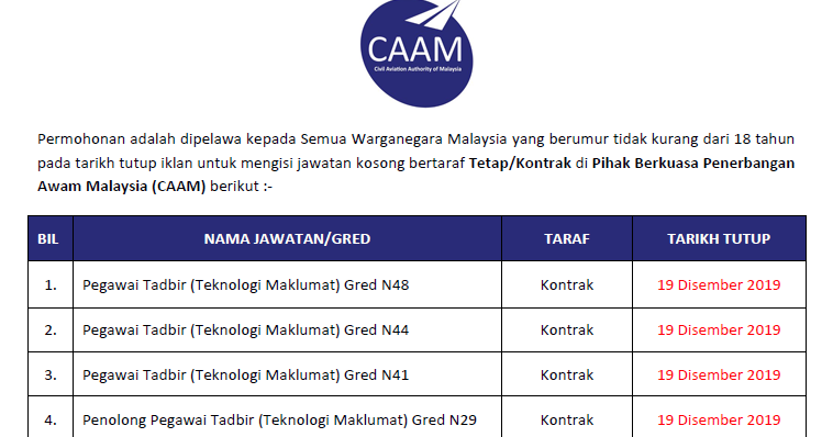 Jawatan Kosong Di Pihak Berkuasa Penerbangan Awam Malaysia Caam 19 Dis 2019 Kerja Kosong 2020 Jawatan Kosong Kerajaan 2020