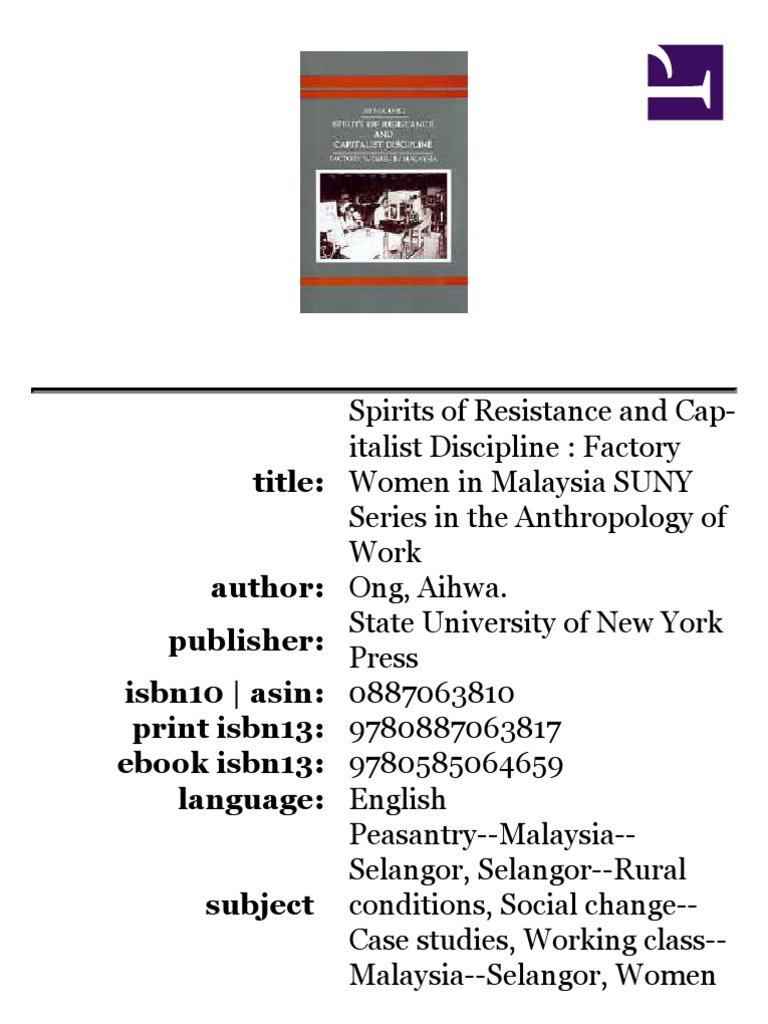 Ong Aihwa Spirits Of Resistance And Capitalist Discipline Factory Women In Malaysia 1987 Capitalism Malaysia