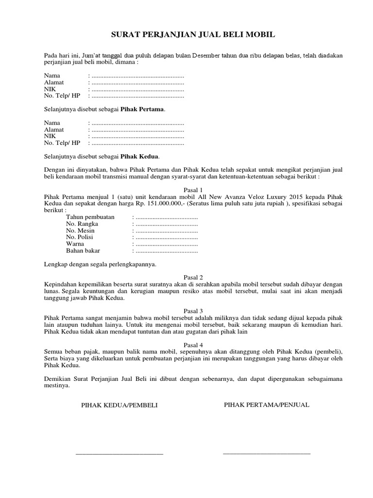 Surat Perjanjian Jual Beli Mobil Yang Baik Dan Benar Contoh Surat